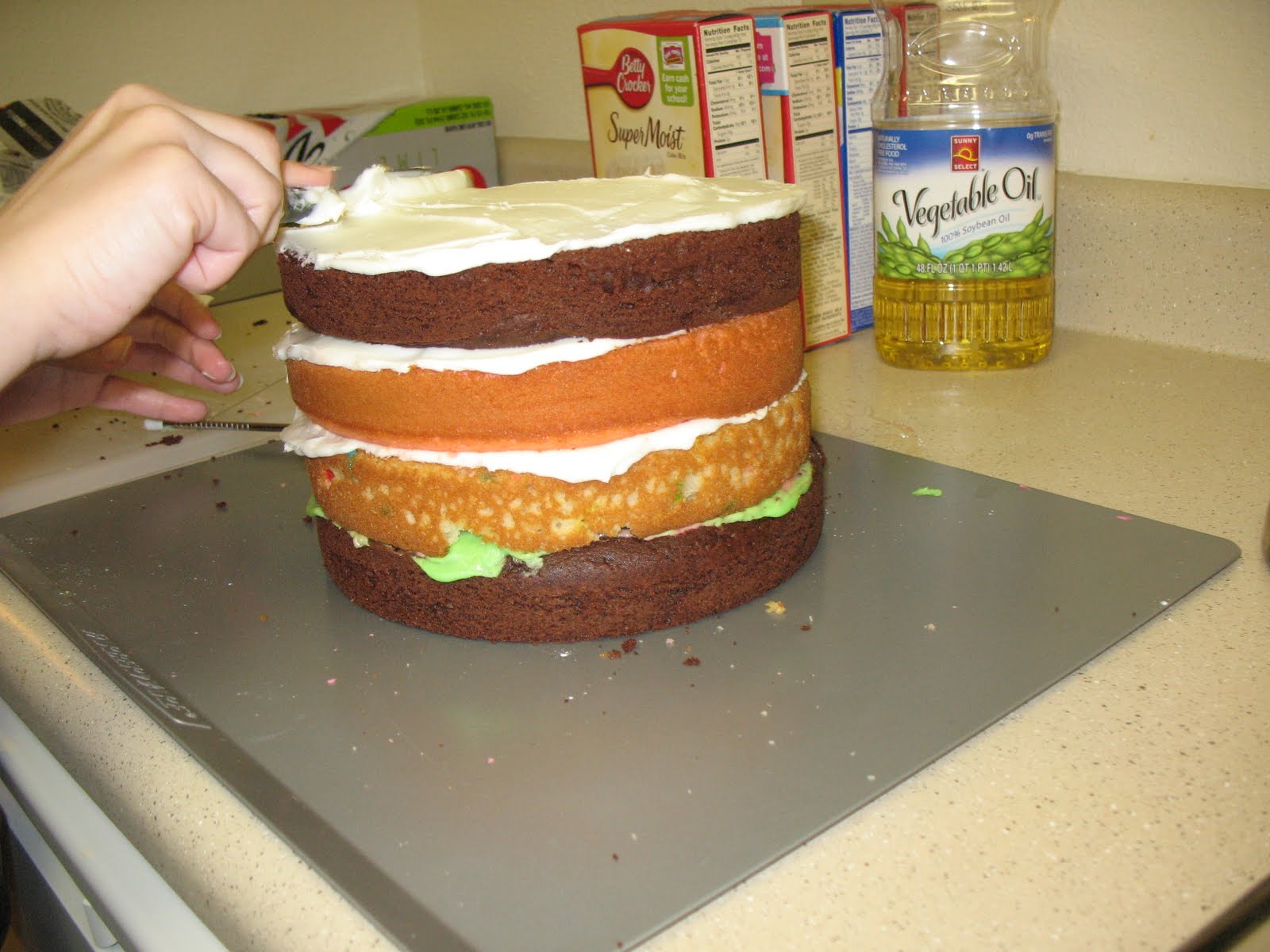 As you can see, we used a mixture of cake types including chocolate, funfetti, and strawberry to make it neapolitan. The colored frosting is from another project that I made while waiting for all the cake to bake off.